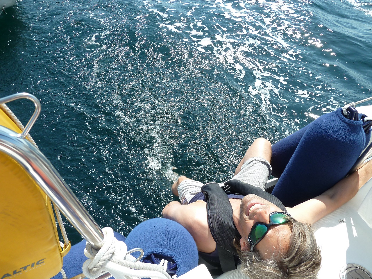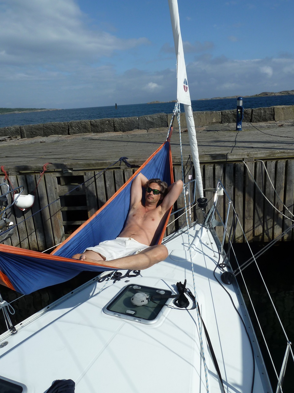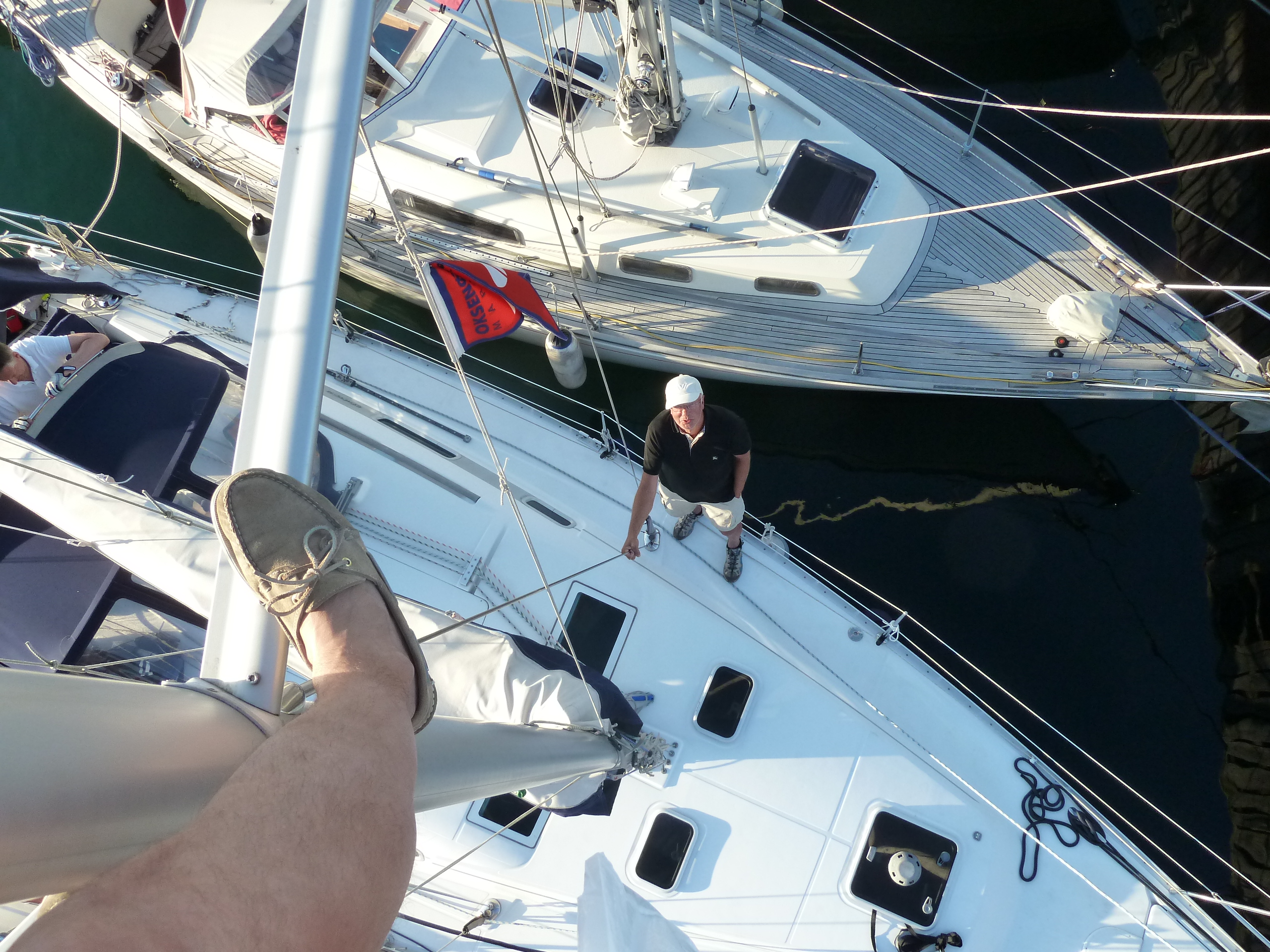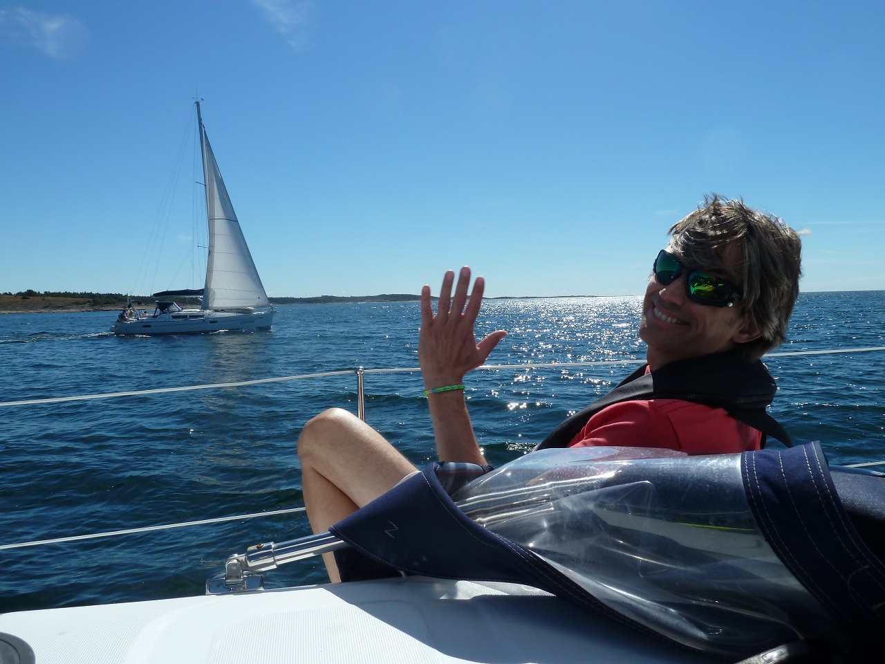 Vi forlot vakre Skudeneshavn i morgentimene og tok fatt på seilasens hittil lengste etappe – retning Bergen. I utseilingen hilste vi på Christian Radich – hvor mannskap dinglet med benene høyt oppe i mastene – ikke noen jobb for de med høydeskrekk :). Nok en gang møtte vi blikkstille hav og varm fønvind på vår vei mot Haugesund. Vi seilet gjennom holmer og skjær, flotte hytter og tung industri etter hvert som vi beveget oss langs Karmøy mot Haugesund… Oljeindustrien merkes godt. Så – på tur ut i Nordsjøen igjen fikk vi skikkelig seilvind. Av med motoren – seilene gjorde jobben! Med godt driv beveget vi oss inn utløpet av Hardangerfjorden. Heretter snek vi oss inn i fjordarmer, noen ganger trangt og uoversiktlig, men desto mer fantastisk opplevelse . I sene kveldstimer ankom vi Bergen seilforening hvor Torvald tok i mot oss med ankervin – koselig!